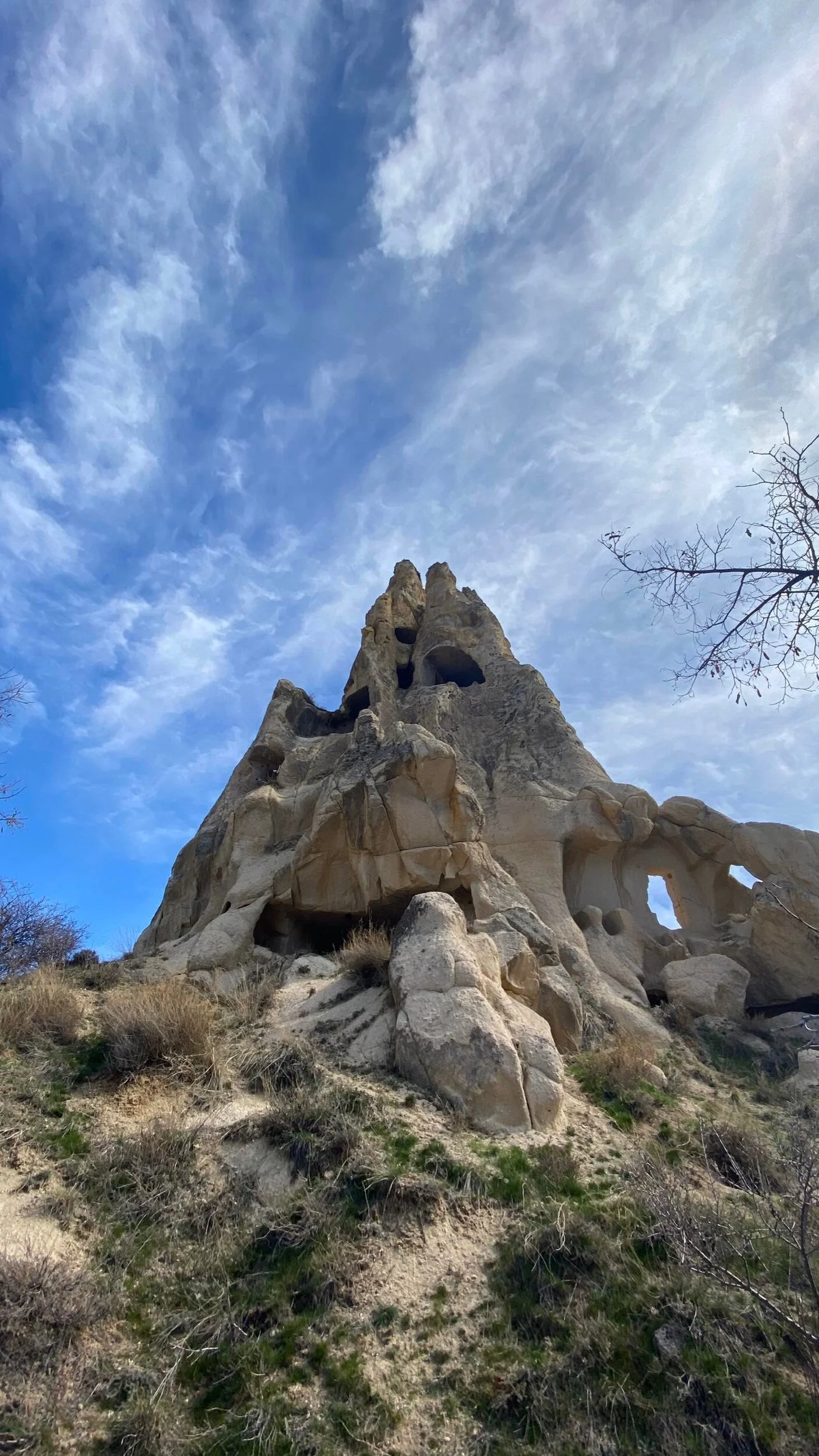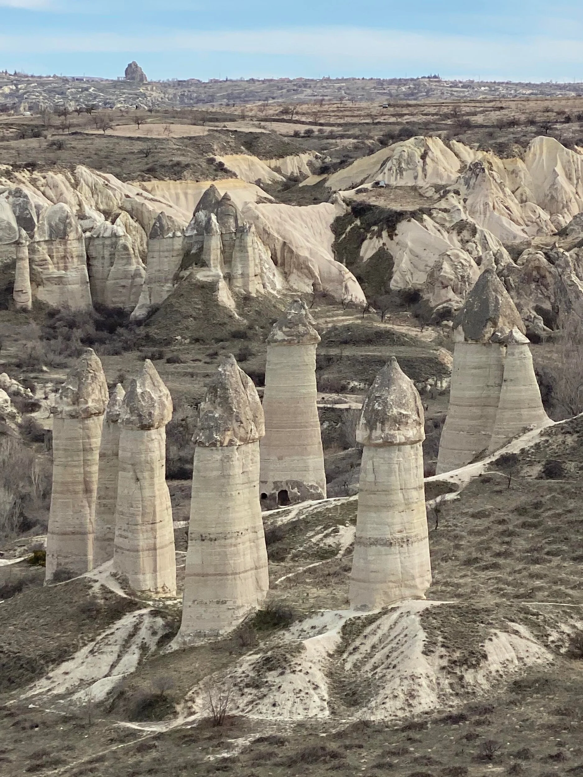 As we soar above the valley of 3 million year old fairy chimneys, unique looking rock formations carved out of the lava rocks by wind and erosion. Tolga tells us it’s his first flight, he isn’t skilled at landing and we might run into the rock we are heading straight towards. The other 5 tourists don’t say a single word. The teens snap away photos and video.